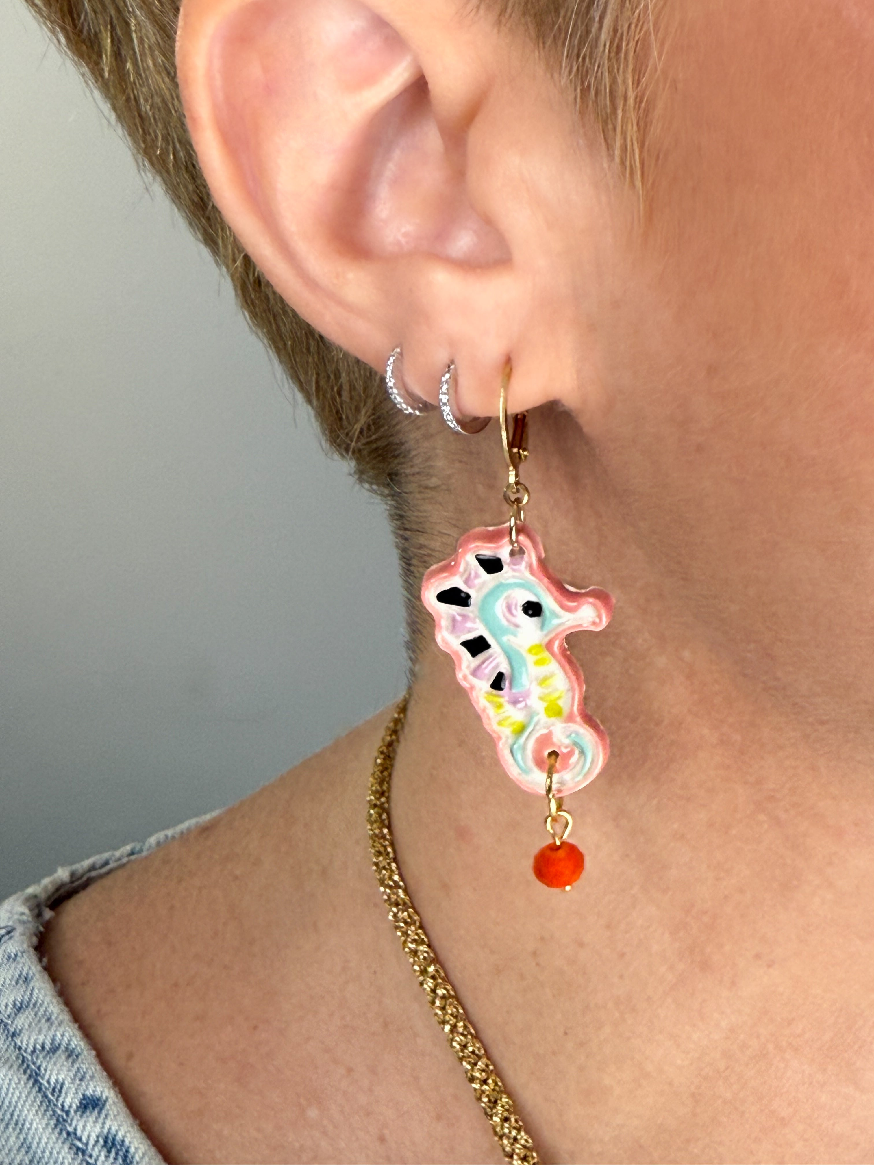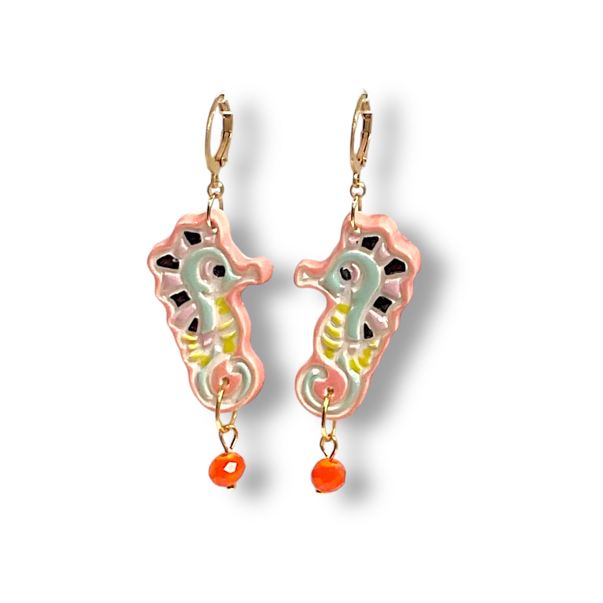 Unos pendientes que parecen sacados de un acuario encantado. Con cuerpo en tonos aguamarina y una cresta rosa suave, estos caballitos de cerámica tienen la gracia juguetona del mar y la elegancia serena de lo artesanal.