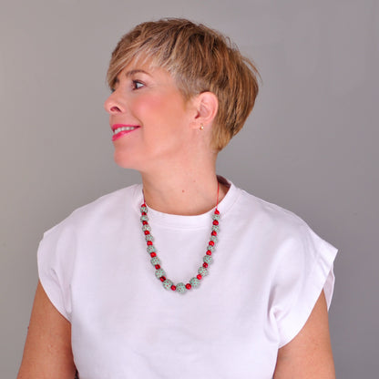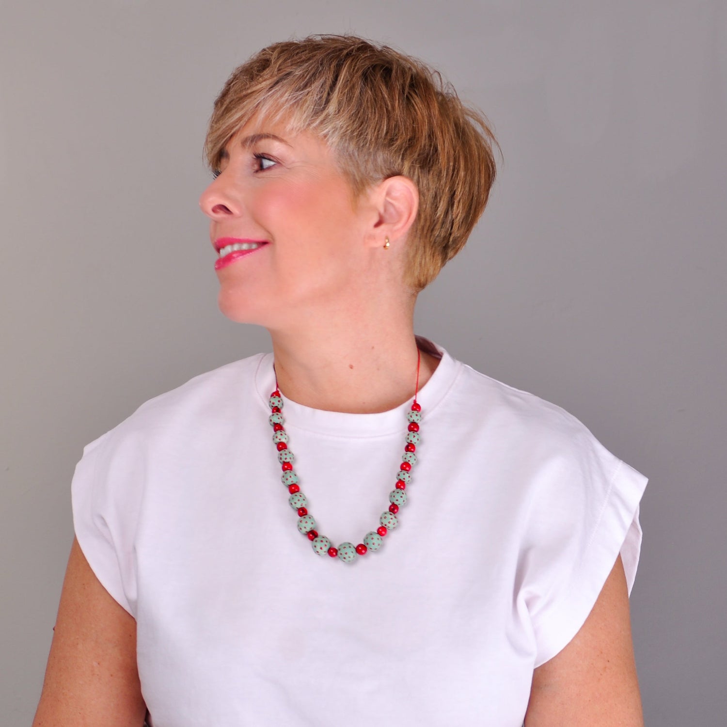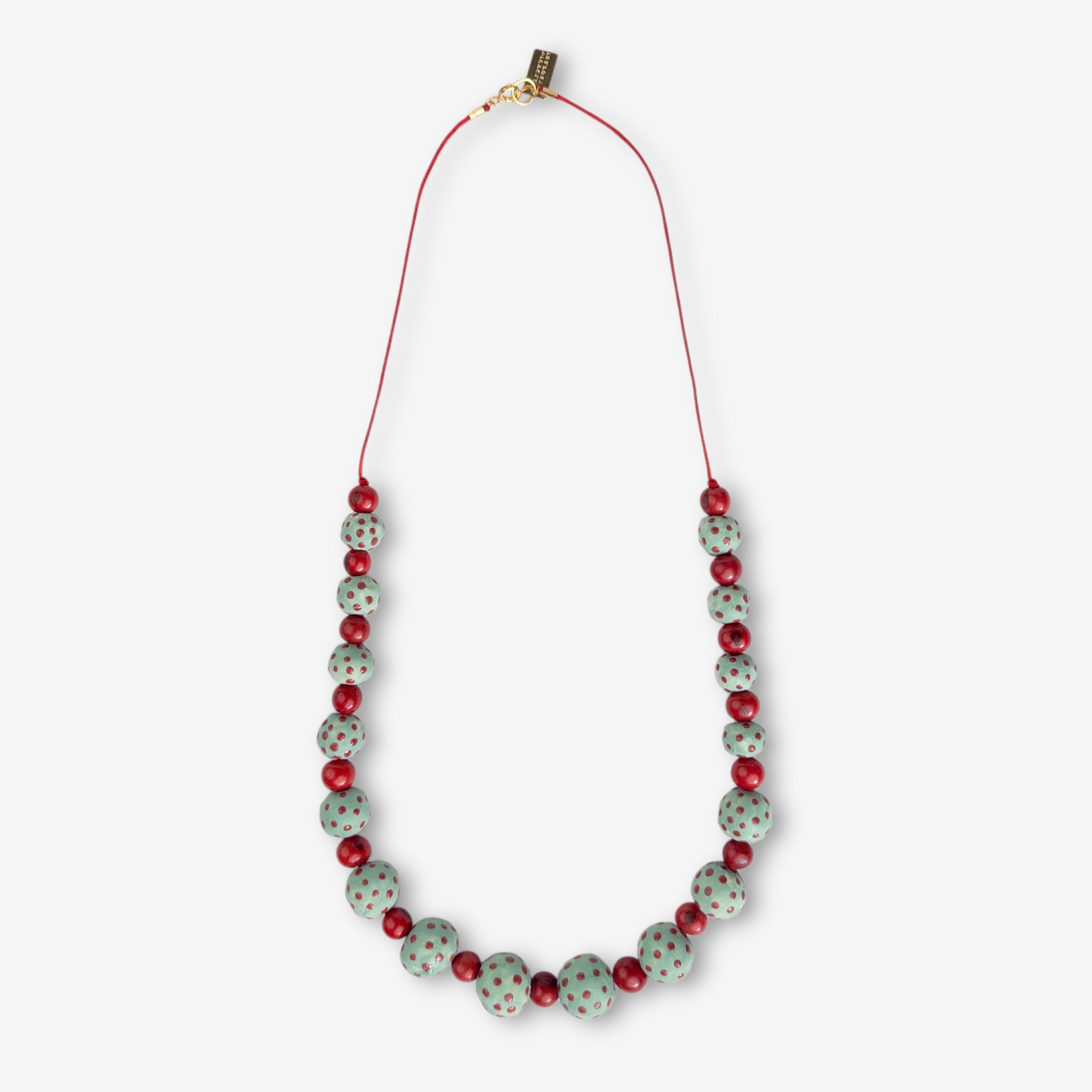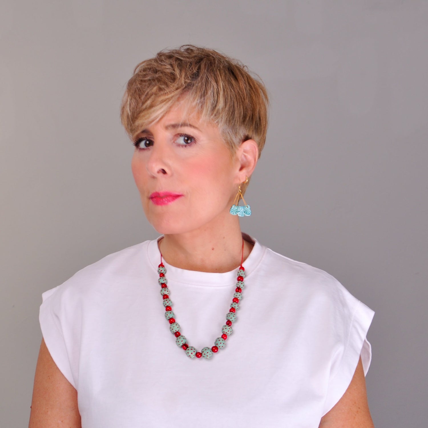 Un collar de largo mediano y sorprendentemente ligero, como una brisa en una tarde de verano. Está formado por cuentas de porcelana combinadas con otras más pequeñas en dos colores que se equilibran con naturalidad: verde suave y rojo intenso.