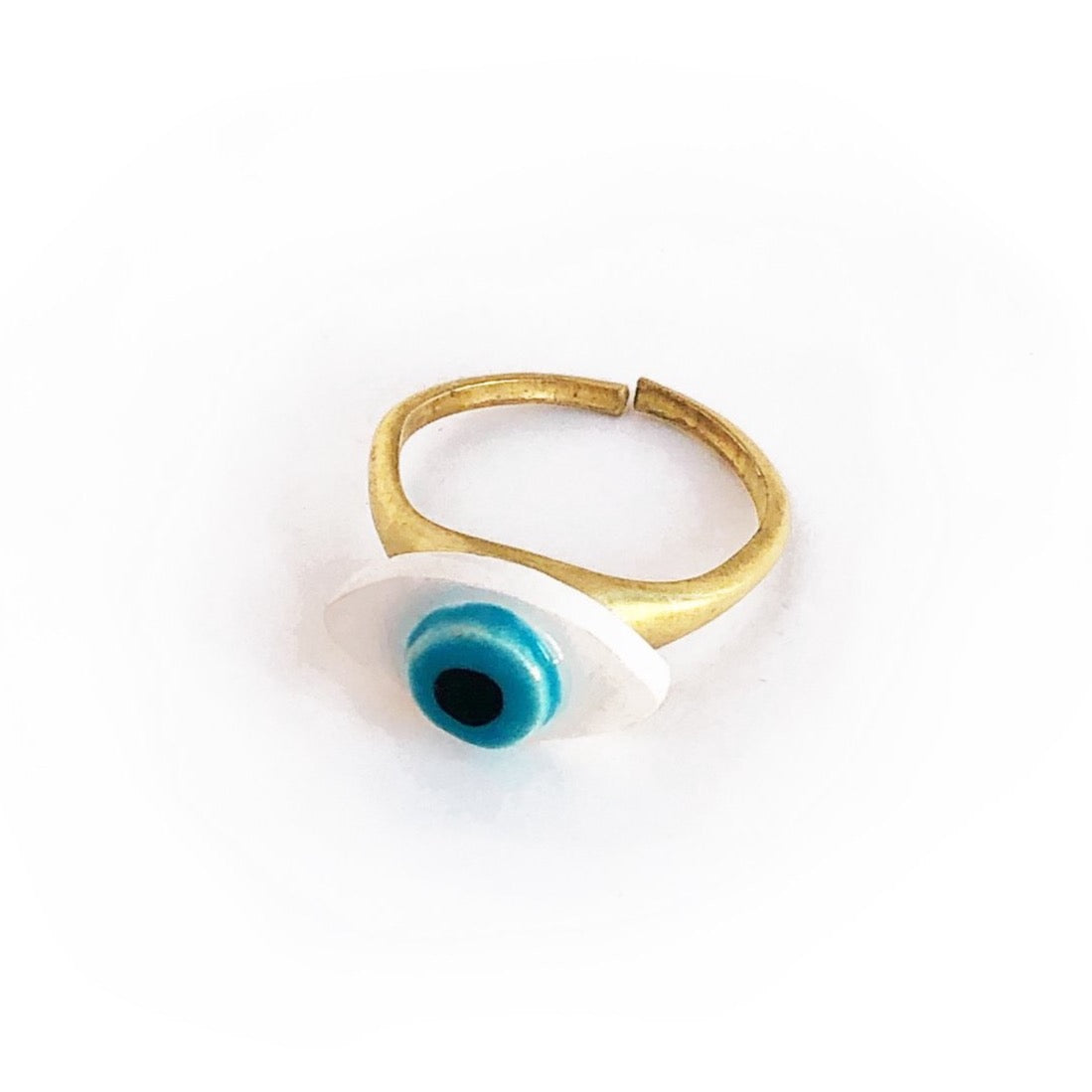 ¡Un ojito de la buena suerte!. Este anillo es una edición muy limitada y está realizado totalmente a mano con un ojito de cerámica y base ajustable de latón.