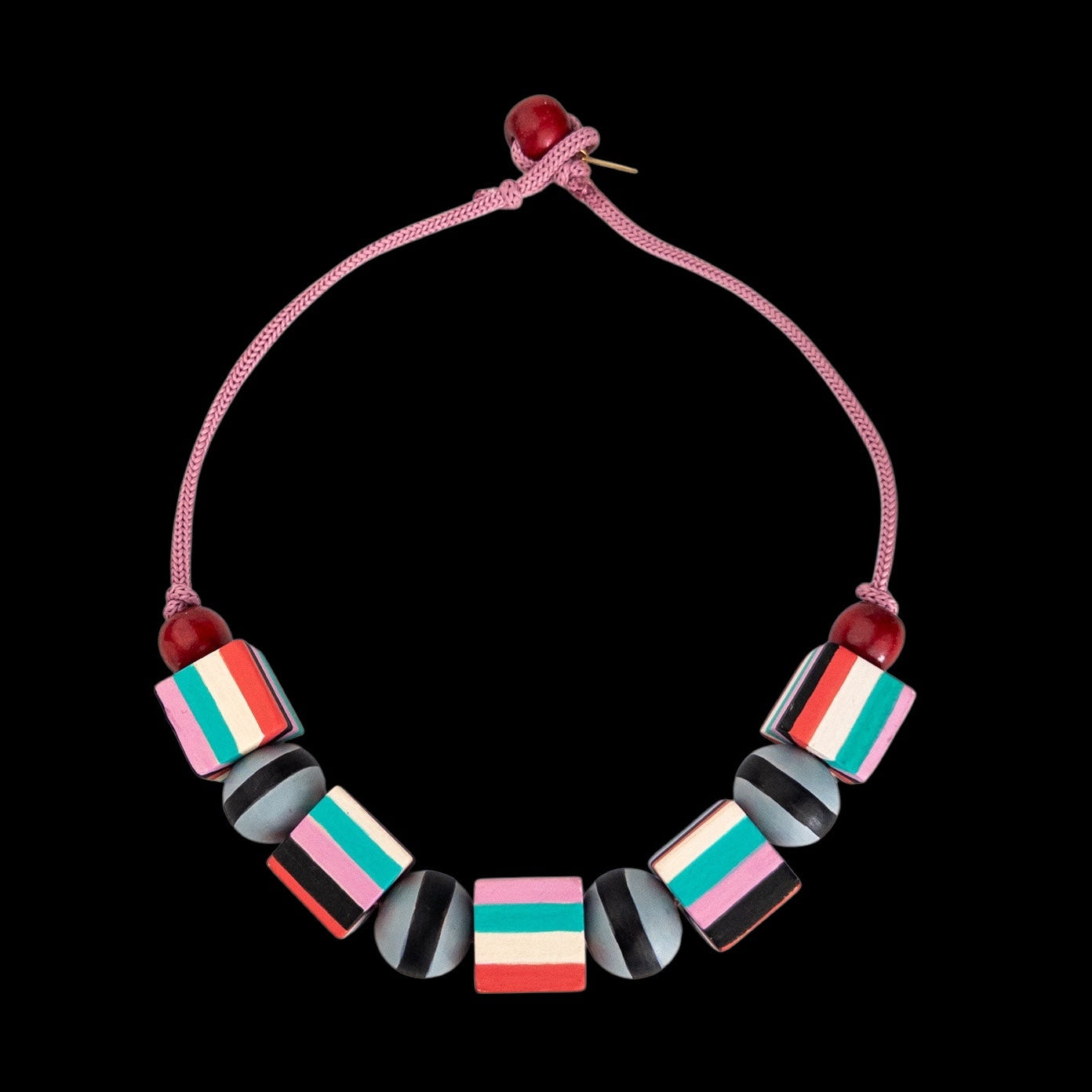 Un collar de formas rotundas y ligeras, donde las piezas de madera —cúbicas y esféricas— alternan colores sobrios como el gris y el negro con toques vibrantes de rosa, blanco y turquesa.