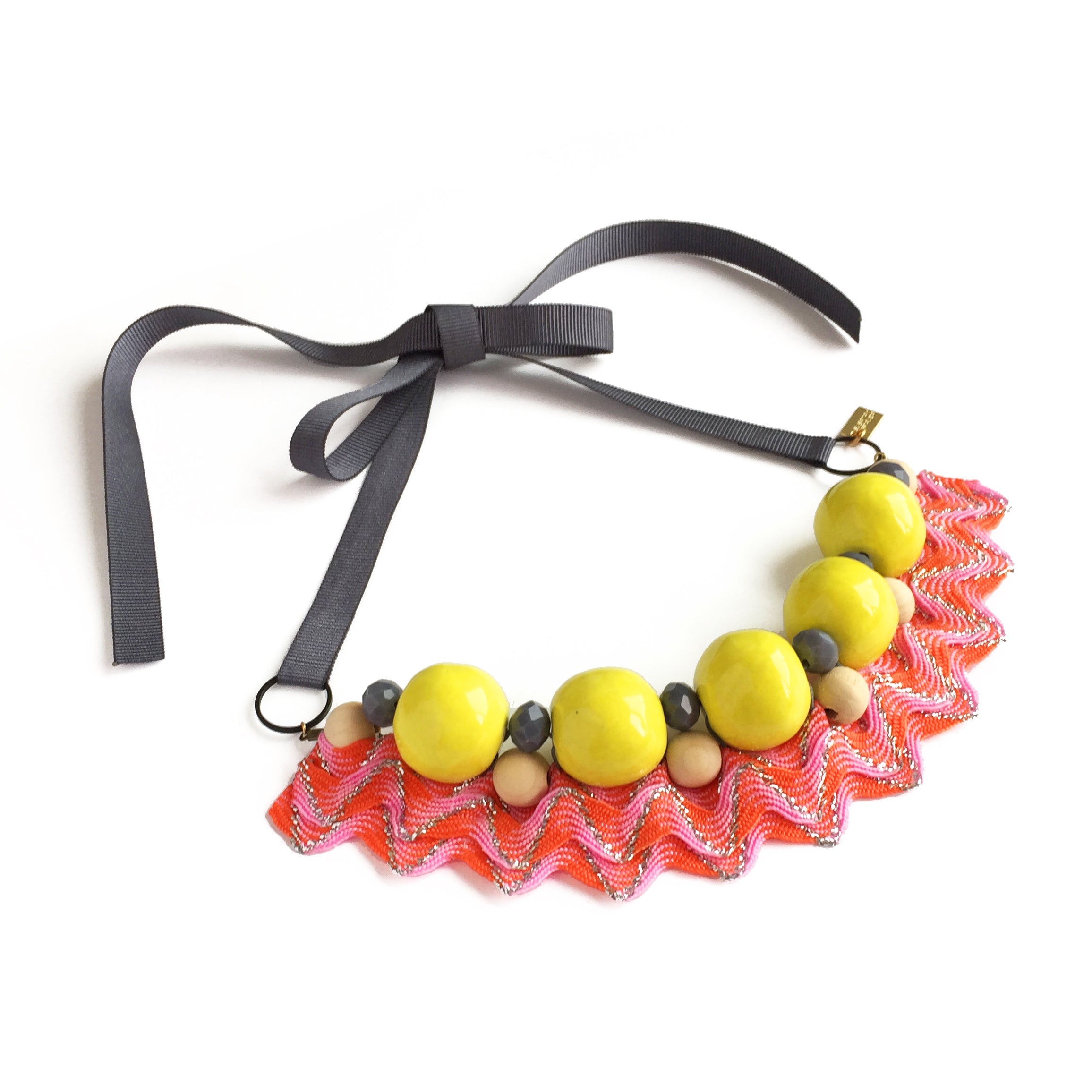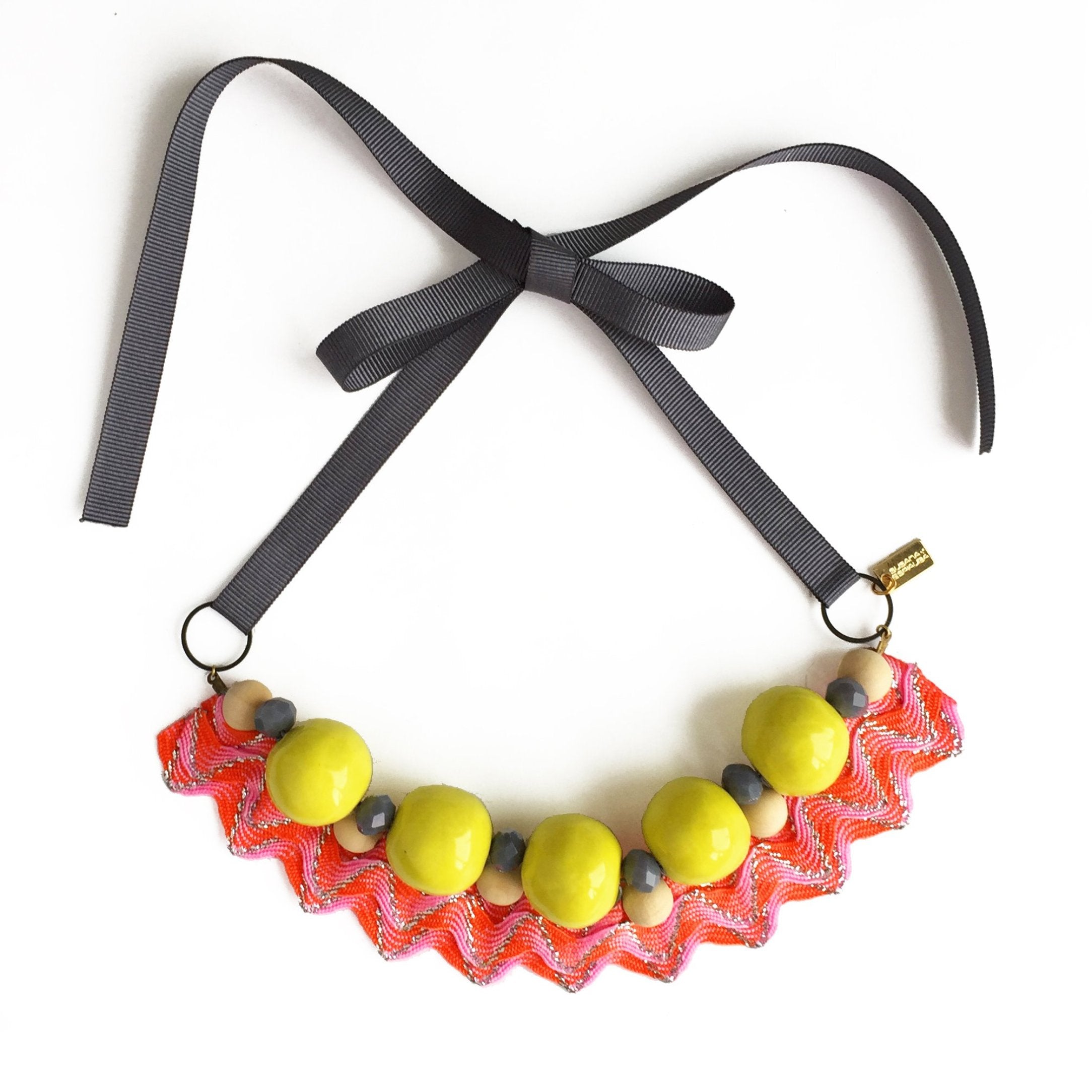Este collar es una edición muy limitada y está realizado totalmente a mano en cerámica, cintas de algodón de ondas y rayas, cuentas de madera, cuentas de cristal rojo y cintas de grosgrain. El largo es ajustable.