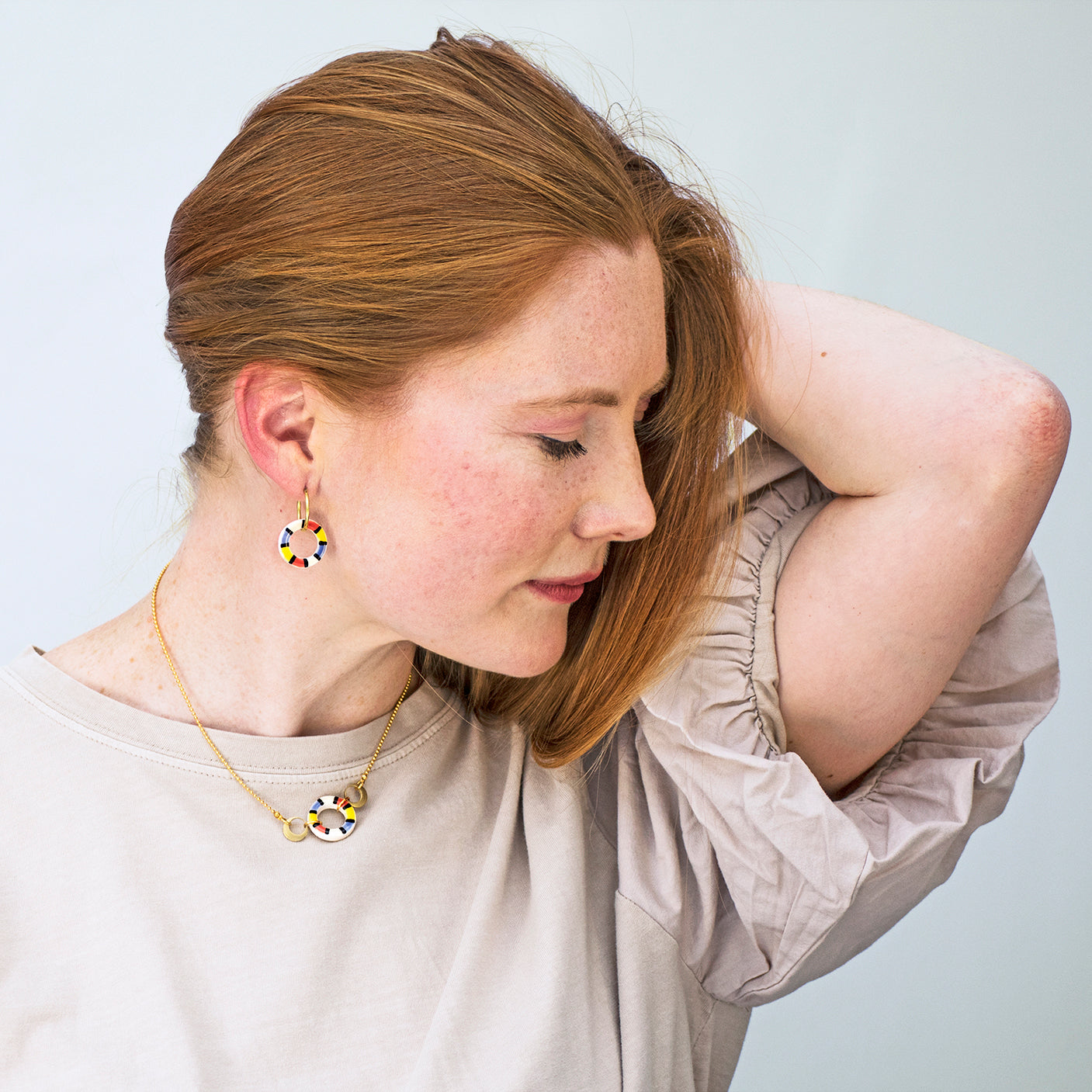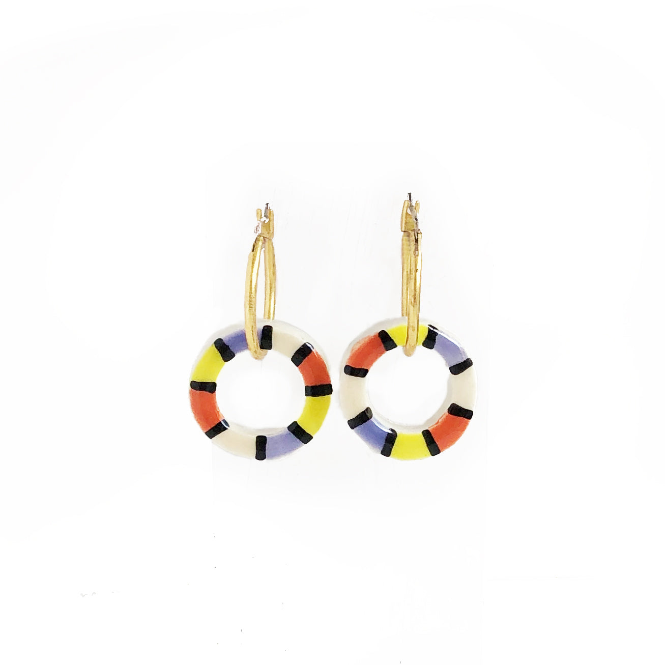 Este collar es una edición muy limitada y está realizado totalmente a mano con una ruedita de cerámica, dos aritos de latón y cierres, cadena y arandelas de latón con baño de oro. El largo total del collar es de 38 cm.