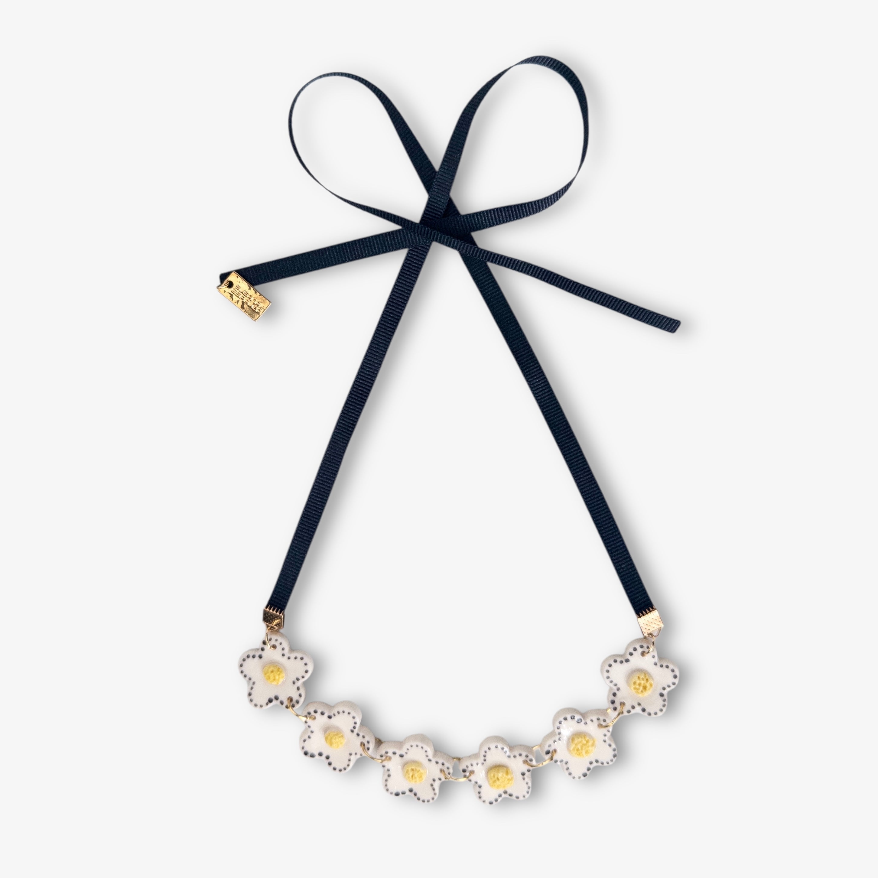 Delicadas flores de porcelana en forma de margaritas componen este collar sutil y encantador. Cada flor está hecha a mano con mimo, y se sujeta a una exquisita cinta de grosgrain que realza aún más su aire nostálgico y femenino.