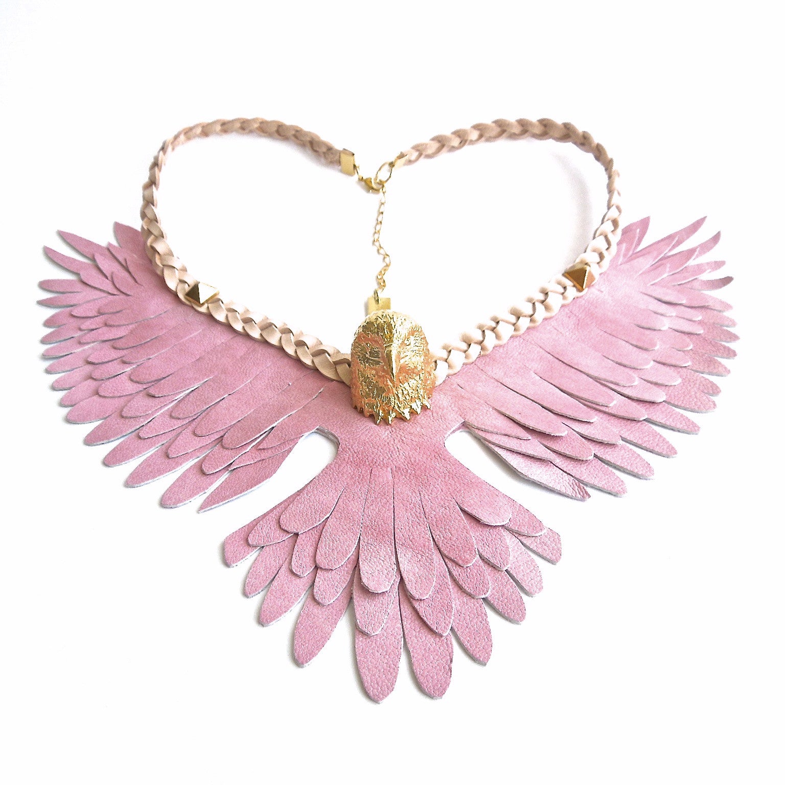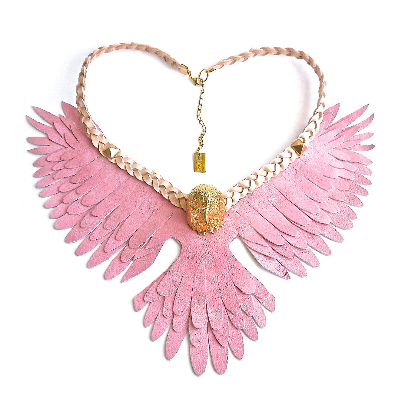 Collar realizado a mano totalmente en genuina piel rosa de primera calidad, en tres capas, con cabeza de águila tallada a mano en latón con baño de oro de 24 kts. El largo del collar es ajustable con la trenza de piel y la cadena posterior. Edición limitada.