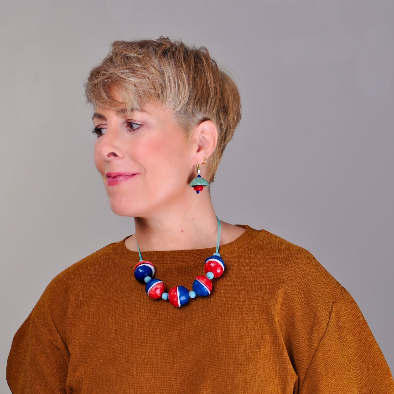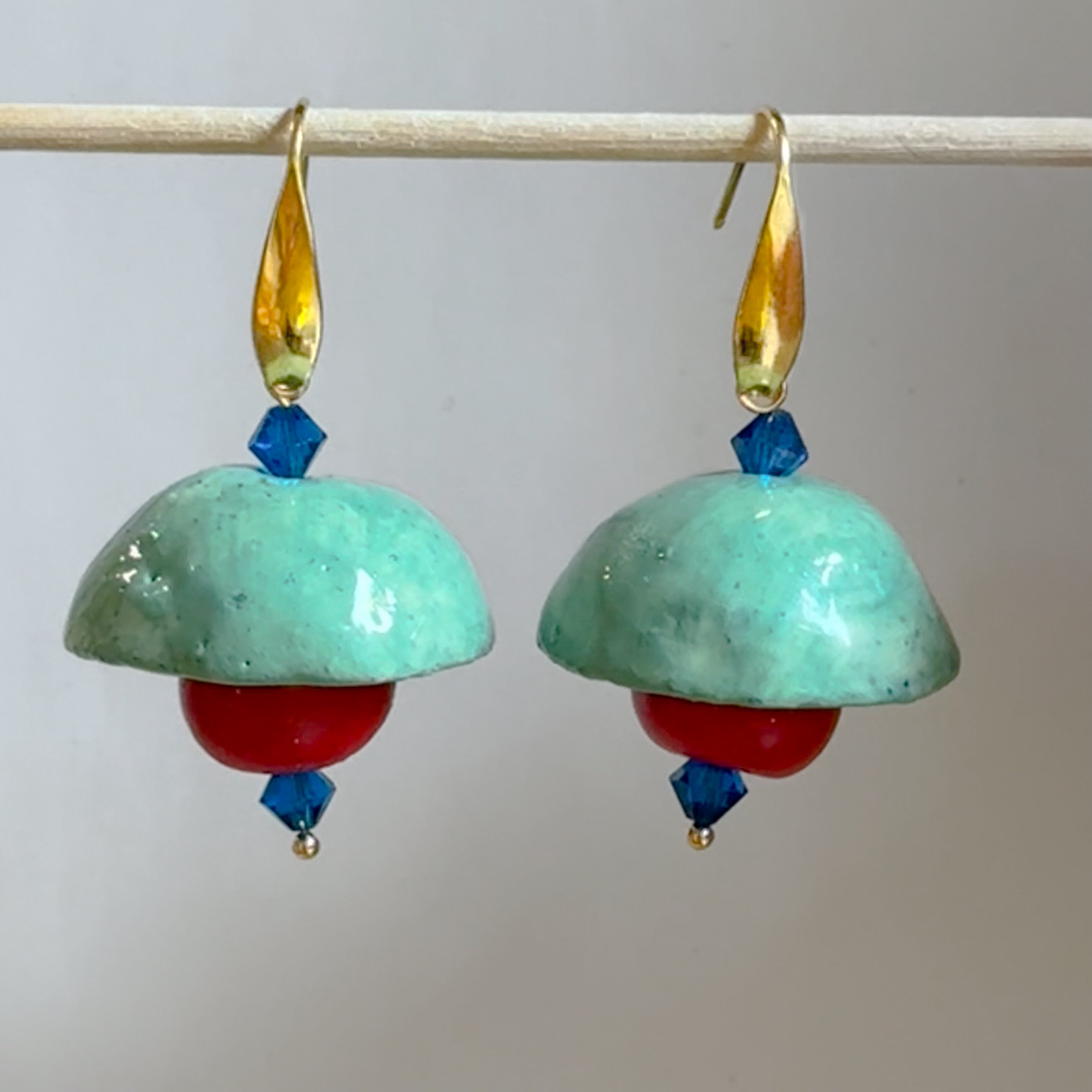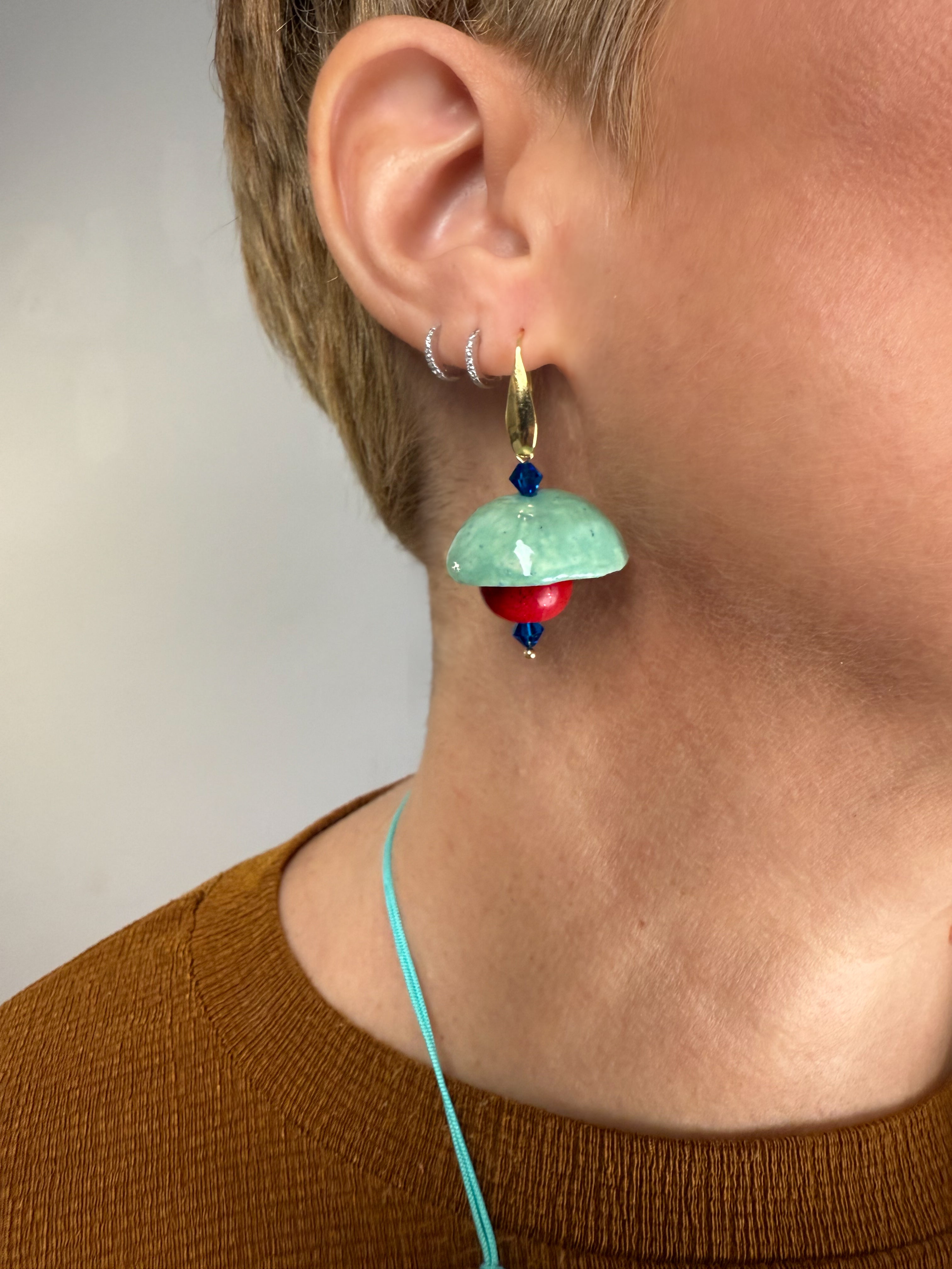 Con forma de pequeñas campanas marinas, estos pendientes de cerámica en turquesa intenso terminan en una bola roja que se balancea como una boya al sol.