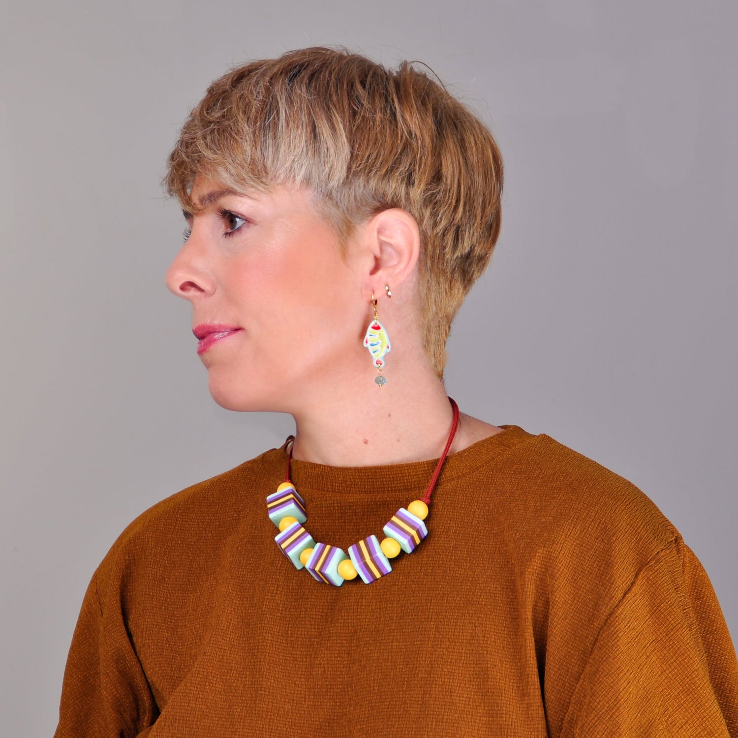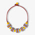 Un juego geométrico que celebra el volumen y el color. Este collar combina piezas de madera cúbicas y esféricas en amarillo, turquesa y morado, engarzadas sobre una suave gargantilla de algodón.