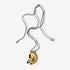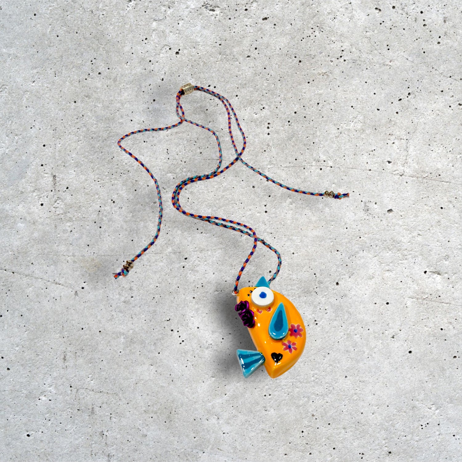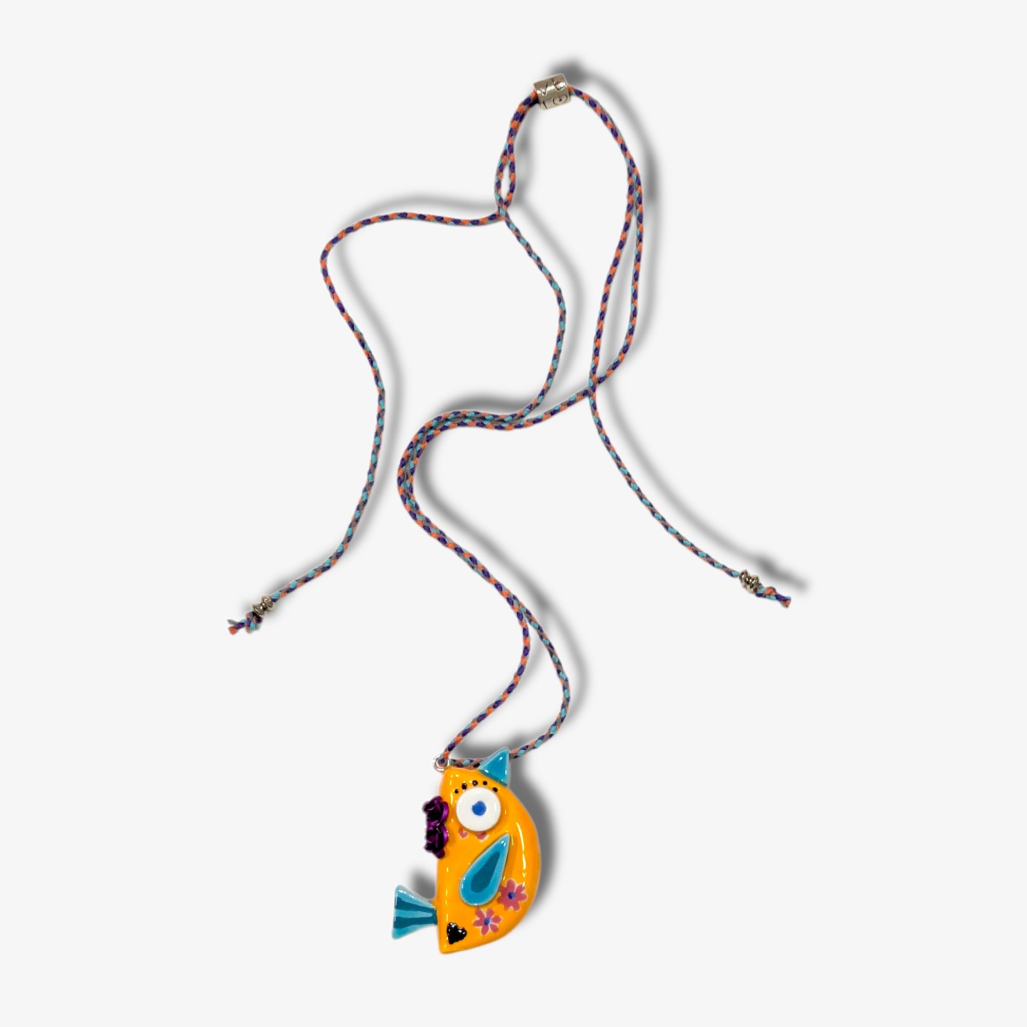 Cuelga de un cordón multicolor que refuerza aún más su carácter juguetón y único.