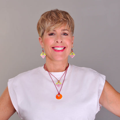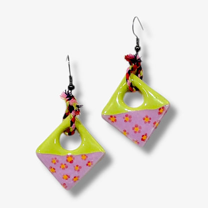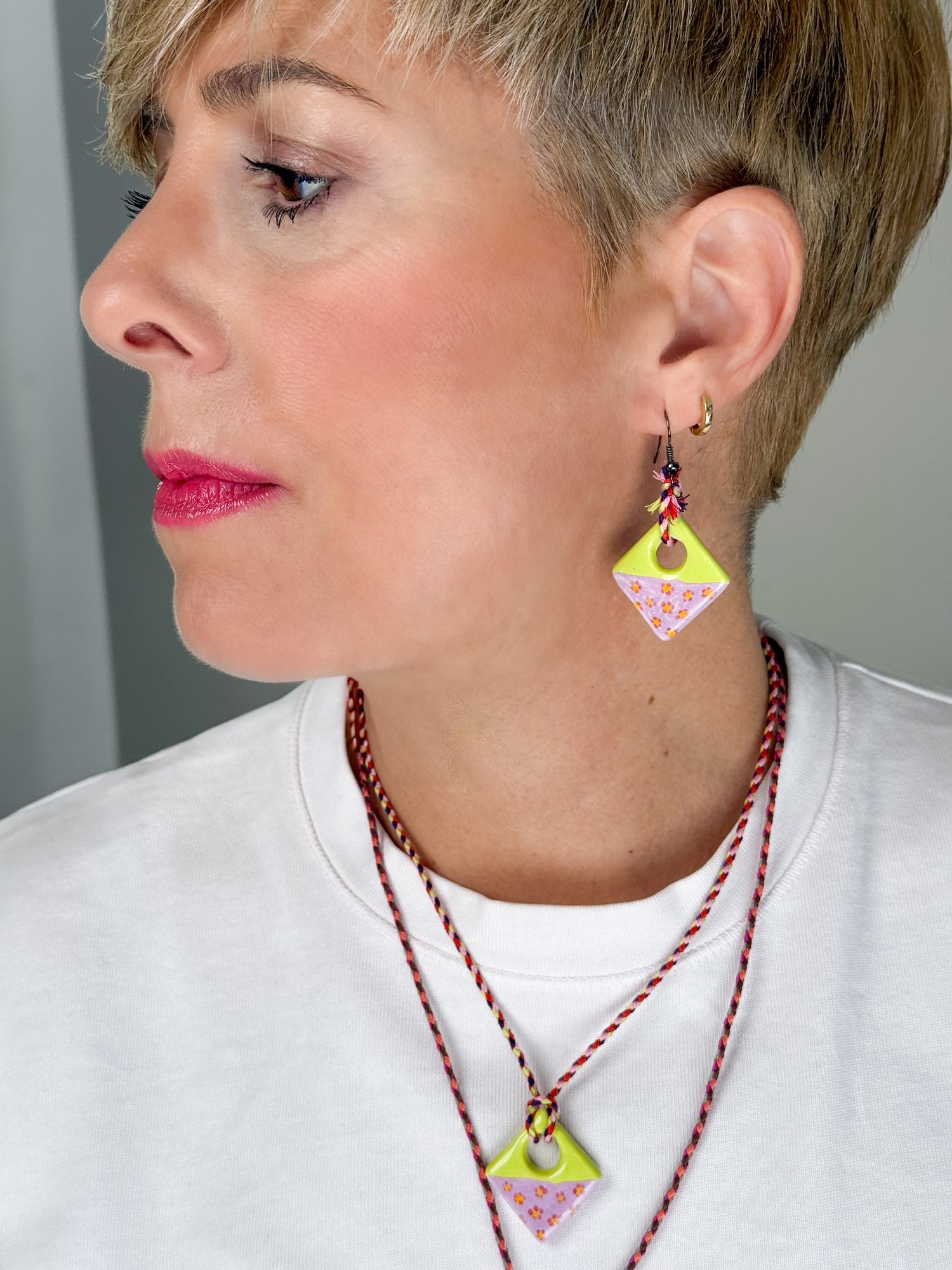 Una forma imposible de ignorar: rombo cerámico, hueco en el centro, y un estampado floral diminuto sobre rosa y verde lima, como un jardín psicodélico en miniatura.