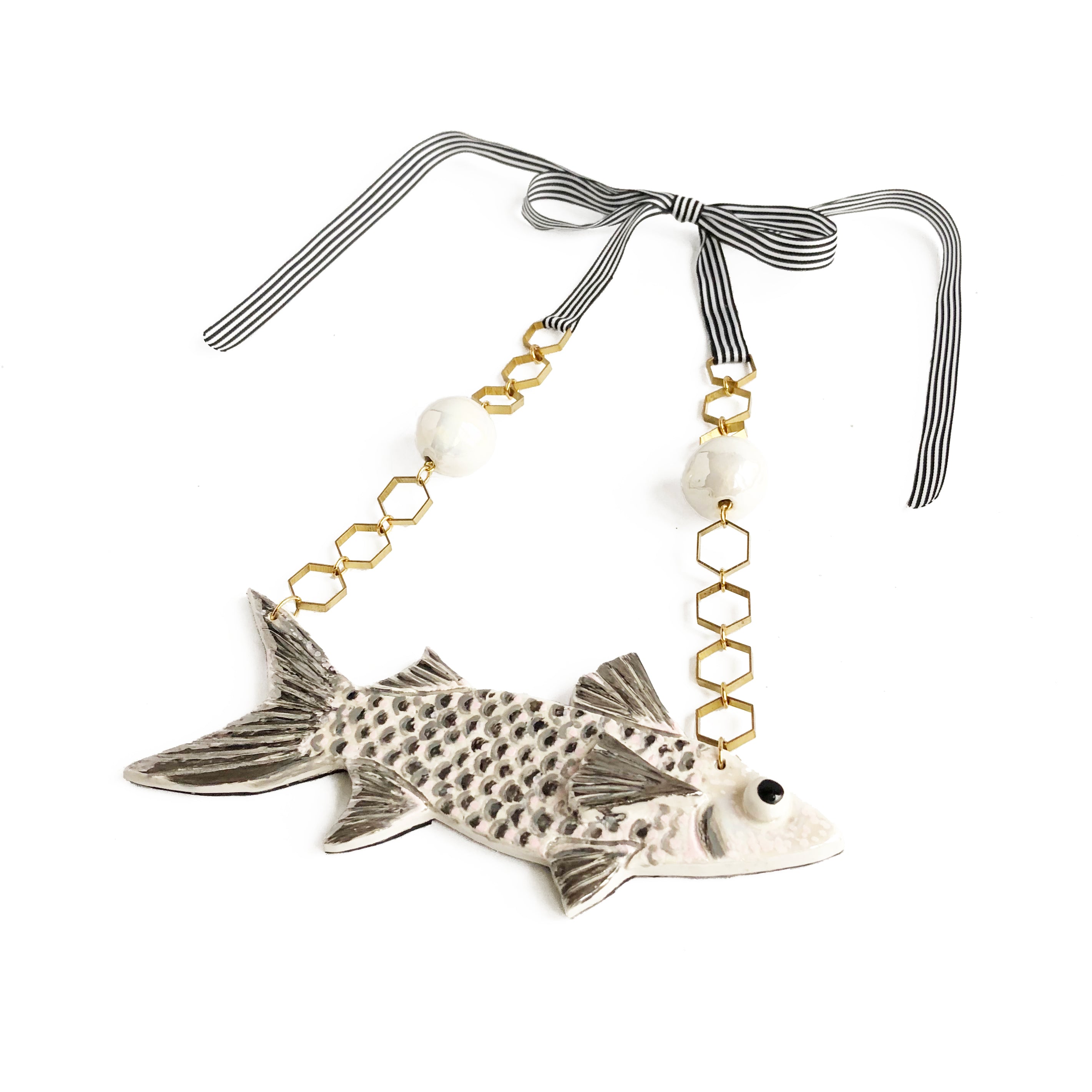 This is a limited edition necklace handmade in ceramic with silver and nacre luster, brass and cotton ribbon. The length is adjustable.