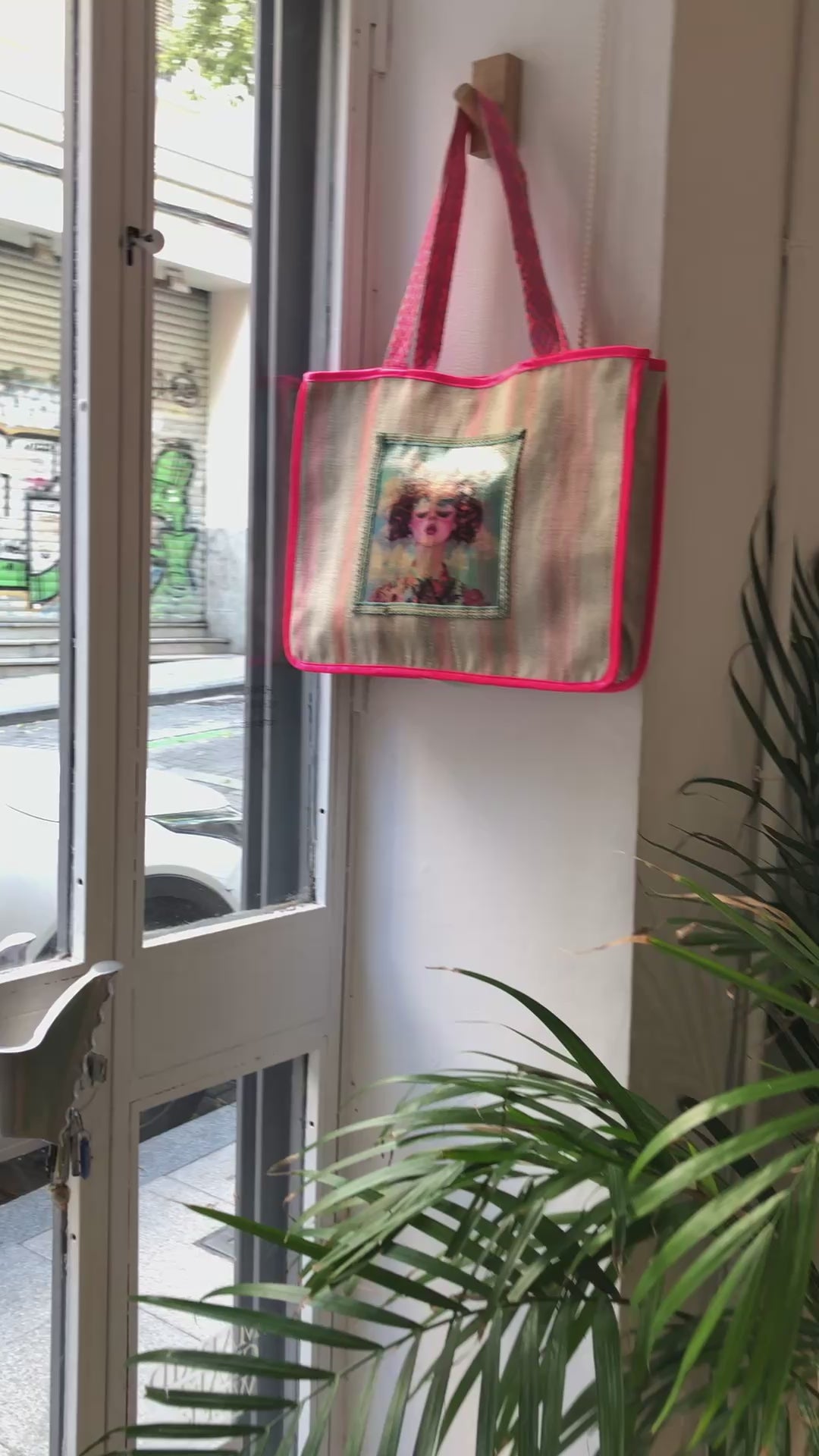 Bolso de diseño único con impresión lavable y detalle de encaje procedente de India. El bolso está realizado en tejidos naturales con el exterior en un precioso gobelino de rayas en crudo, gris y rosa y el interior forrado con loneta 100% algodón. Lleva un bolsillo interior y un cierre de imán. Todas las costuras están rematadas con un bies de raso en rosa fosforito. Es muy muy ligero. Tiene unas dimensiones de 35x27x8 cm con dos asas de 50 cm cada una.
