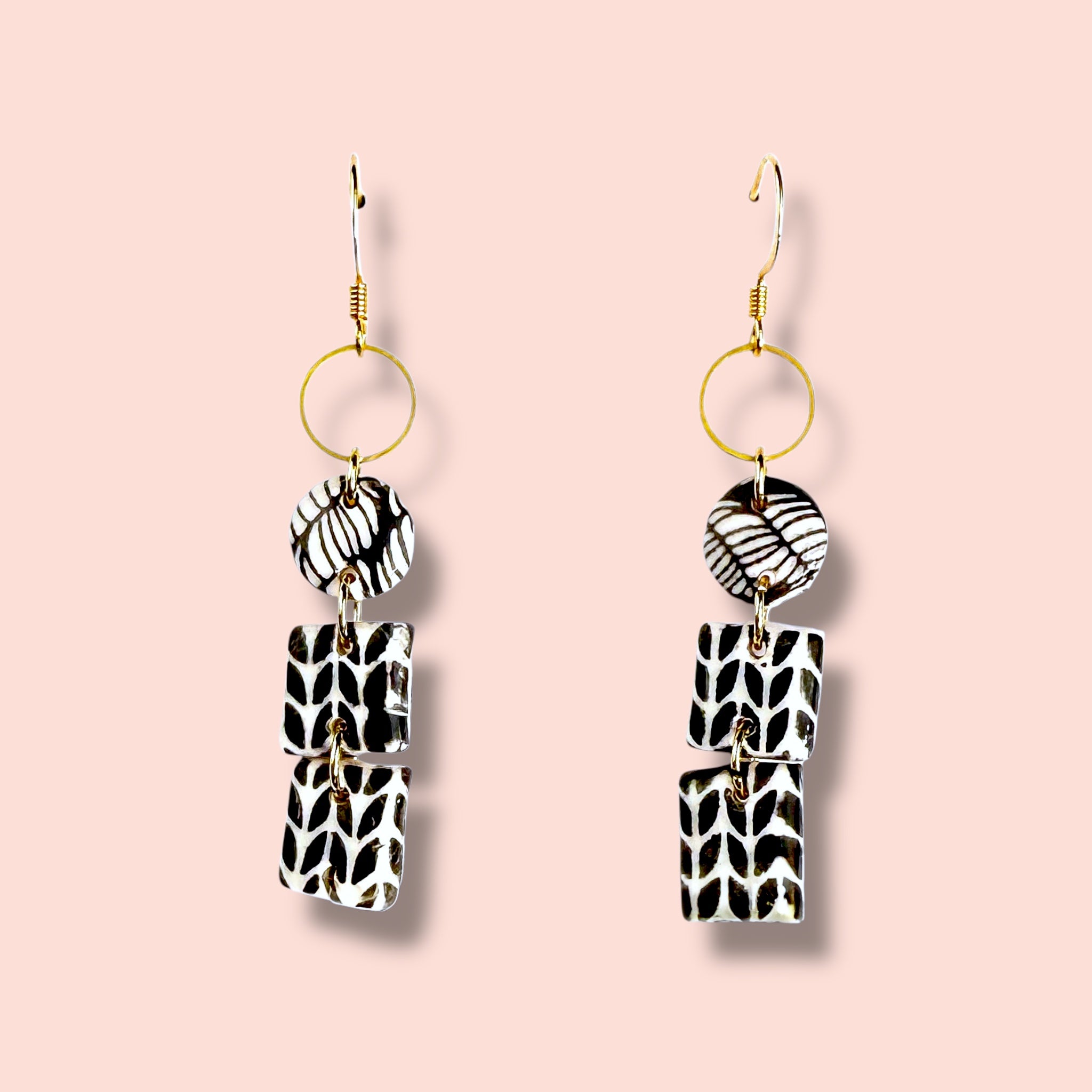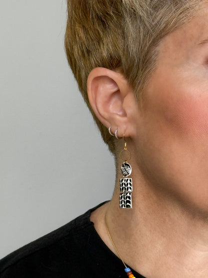 Pendientes articulados de cerámica blanca y negra, pintados a mano con un patrón de espigas estilizadas. Sus piezas móviles se mueven con el cuerpo, como los campos de trigo al viento.